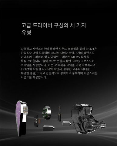 EP321은 앞서 설명하였듯 6개의 드라이버로 구성되어 있습니다. EP321은 세계 최초로 별도 증폭기 없이 구동되는 Direct-Drive MEMS를 하이브리드 IEM에 본격 적용한 모델로, 기존 MEMS 트위터처럼 외장 에너자이저에 의존하지 않고 내장 승압 설계만으로 일반 플레이어에 직결해도 초고역대 재생이 가능하다는 점이 핵심입니다. 이로 인해 초고음역에서 과응답과 미세 디테일 표현이 살아나, 고음이 거칠게 쨍하기보다는 깨끗하고 정확하게 뻗는 성향을 보여줍니다.